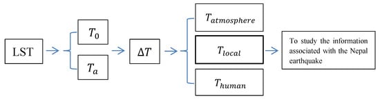 Among many methods for exploring the premonitory signals before an earthquake, satellite thermal infrared remote sensing has received worldwide attention in the exploration of earthquake precursors [,,]. Many examples of thermal infrared anomalies have been reported [,,,,,,,,]. A variety of anomaly extraction methods and their possible physical mechanisms have also been proposed [,,,,,,,,,,]. However, there is still a high degree of controversy regarding satellite thermal infrared anomalies [,]. This controversy is, at least partially, is related to the complexity in anomalies of thermal infrared remote sensing. The thermal infrared information received by satellites is mainly thermal radiation from the land surface, which has been modified by the atmosphere, including a large variety of complex meteorological and other non-seismic factors. Eliminating the influence of these factors is very important for understanding these kinds of thermal anomalies []. Temperature changes produced by meteorological factors can reach the order of a few or even a dozen degrees Celsius, and the abnormal information related to earthquakes may be completely submerged by meteorological changes. Having appropriate methods and detailed data processing to extract thermal information before an earthquake is necessary. In this paper, taking the April 2015 Nepal Mw 7.9 Earthquake as a case, the following aspects are considered. (1) First, determine the known information as thoroughly as possible, especially non-tectonic factors such as atmospheric and solar influences, and then look for possible earthquake-related information from the remaining information. (2) If a piece of information is related to an earthquake, it should be spatially related to the seismogenic structure; it should temporally include coseismic information; and even if there is an earthquake precursor, the change should become more significant at the occurrence of the earthquake. (3) The earthquake-related phenomenon should be repeated when using data from different satellites. The processing of satellite data can also generate uncertainty, especially for long-term satellite data. Using different satellite data for verification is best. If different satellites detect the same phenomenon, then at least the phenomenon itself is reliable.