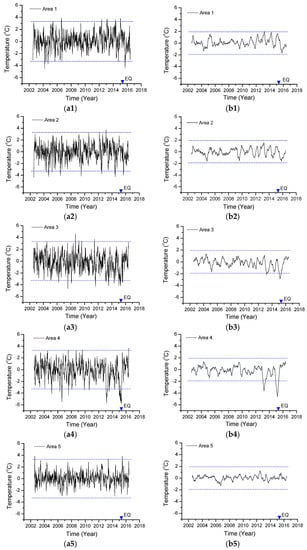 After smoothing, the temperature fluctuation is between –4.6 and 2.02 °C; the standard deviation is significantly reduced to between 0.37 and 0.95 °C. Similarly, the maximum standard deviation of the five areas is 0.95 °C, which is taken as the reference value, denoted as SRefStd. The lines in Figure 4b1–b5 represent the double SRefStd. As shown in Figure 4b1–b5, only study areas 3 and 4 are more than the double SRefStd (Figure 4b3,b4), and both were cooling before the earthquake. Among these areas, the strongest deviation corresponds to the occurrence of the earthquake.