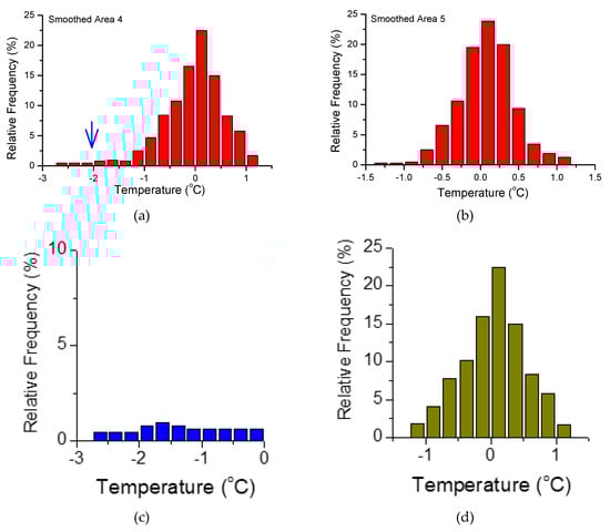 Figure 4b and Figure 5a show the frequency distribution of the smoothed temperature values of study area 4 and area 5 (Figure 4b4,b5). Figure 5 illustrates that (i) in the range of [−1.5 , 1.5 ], the distributions of the two study areas are similar and should be close to the same distribution pattern (Figure 5a,b); (ii) in the range of [−3.0 , −1.5 ], there is another temperature distribution pattern for study area 4, which is close to a uniform distribution (Figure 5c). That is, the temperature distribution of study area 4 includes a temperature distribution pattern different from that of study area 5. We simply decompose the temperature distribution contained in study area 4 into two cases, close to the average distribution and the normal distribution, as shown in Figure 5c,d. Given these two distributions, for the distribution shown in Figure 5c, the value in [−3.0 , −1.5 ] is the same as that shown in Figure 5a, and the value in [−1.5 , 0 ] is the mean of [−3.0 , −1.5 ]. The distribution pattern in Figure 5d is similar to that in Figure 5b. The distribution shown in Figure 5c reflects the temperature distribution of the difference between study areas 4 and 5, and the difference is mainly reflected in the low-temperature part. This result is consistent with the characteristics of the cooling for the time course performance.