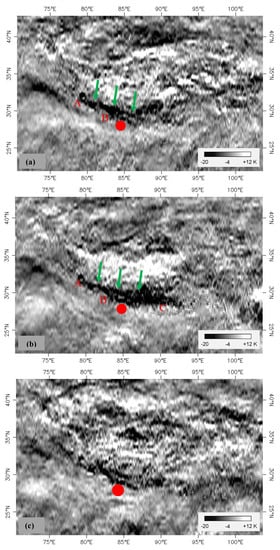 Figure 6 shows the spatial distribution of the local temperature  before and after the Nepal earthquake. In Figure 6, the most obvious feature is the apparent temperature decrease near the epicenter at the time of the earthquake (Figure 6b), referred to as coseismic cooling. The coseismic cooling is mainly distributed in study area 3 and area 4. After the earthquake, the cooling strip is obviously weakened. The coseismic cooling strips are distributed along the Himalayas and are approximately 1300 km long. The widths of the East and West sides of the coseismic cooling strips are slightly different, with an average temperature decrease of 5.6 . The Western section (AB) is approximately 90 km wide and 500 km long, and the East side (BC) is approximately 190 km wide and 800 km long.