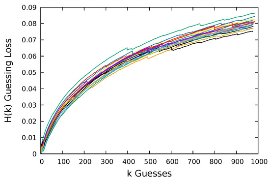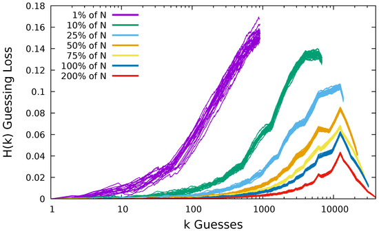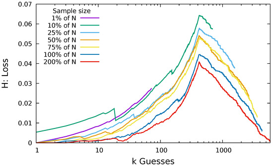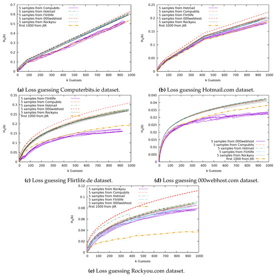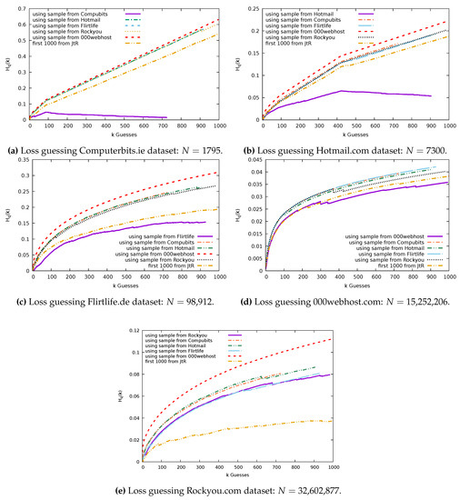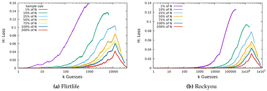 Figure 11a shows that the sample from Computerbits guesses the remaining users’ passwords in Computerbits with less loss than guessing with samples from Rockyou, 000webhost, Flirtlife, or Hotmail. However, though Computerbits offers the best guessing, the loss as a result of guessing the Computerbits dataset is very high (