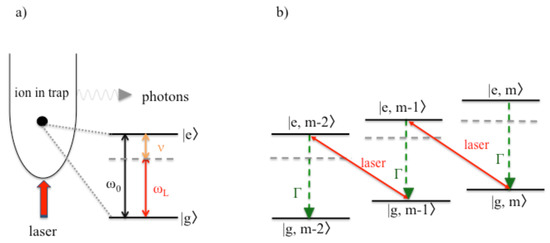 To lower the temperature of the atom, the frequency of the cooling laser needs to be below its transition frequency . Ideally, the laser detuning equals the phonon frequency (cf. Equation (1)). In addition, the spontaneous decay rate of the excited atomic state should not exceed (cf. Equation (2)). When both conditions apply, the cooling laser couples most strongly, i.e., resonantly and efficiently, to transitions for which the excitation of the atom is accompanied by the simultaneously annihilation of a phonon. All other transitions are strongly detuned. Moreover, the spontaneous emission of a photon only affects the electronic but not the vibrational states of the atom. Hence, the spontaneous emission of a photon usually indicates the loss of one phonon. Suppose the atom was initially prepared in a state . Then, its final state equals . One phonon has been permanently removed from the system which implies cooling. As illustrated in Figure 2b, the trapped particle eventually reaches its ground state where it no longer experiences the cooling due to off-resonant driving [19,20].