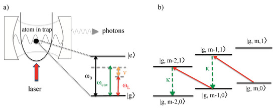 Suppose we want to cool a single atom whose transition frequency is well above the optical regime, i.e., much larger than typical laser frequencies . In this case, it is impossible to realize the condition in Equation (1). Hence, it might seem impossible to lower the temperature of the atom via laser cooling. To overcome this problem, we confine the particle in the following inside an optical resonator (cf. Figure 3) and denote the cavity state with exactly n photons by . Using this notation, the energy eigenstates of the atom–phonon–photon systems can be written as . Moreover, is again the phonon frequency, denotes the spontaneous cavity decay rate and and denote the laser and the cavity frequency, respectively.