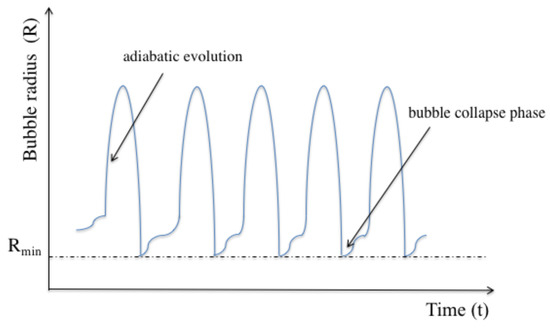 Sonoluminescence can be defined as a phenomenon of strong light emission from collapsing bubbles in a liquid, such as water [32,33,34]. These bubbles need to be filled with noble gas atoms, such as nitrogen atoms, which occur naturally in air. Alternatively, the bubbles can be filled with ions from ionic liquids, molten salts, and concentrated electrolyte solutions [48]. Moreover, the bubbles need to be acoustically confined and periodically driven by ultrasonic frequencies. As a result, the bubble radius changes periodically in time, as illustrated in Figure 5. The oscillation of the bubble radius regenerates itself with unusual precision.