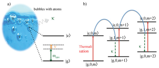 A main difference between sonoluminescence and cavity-mediated collective laser cooling is the absence and presence of external laser driving (cf. Section 2.3). However, even in the absence of external laser driving, there can be a non-negligible amount of population in the excited atomic states . This applies, for example, if the atomic gas inside the cavitating bubble is initially prepared in the thermal equilibrium state of a finite temperature T. Once surrounded by an optical cavity, as it occurs during bubble collapse phases, excited atoms can return into their ground state via the creation of a cavity photon (cf. Figure 6). Suddenly, an additional de-excitation channel has become available to them. As pointed out in Refs. [29,30], the creation a cavity photons is more likely accompanied by the creation of a phonon than the annihilation of a phonon since