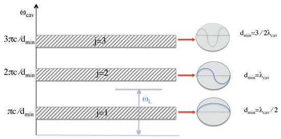 where c denotes the speed of light in air and is an integer. As illustrated in Figure 7, the case corresponds to a cavity photon wavelength . Moreover, corresponds to , and so on. Under realistic conditions, the cavitating bubbles are not all of the same size which is why every j is usually associated with a range of frequencies (cf. Figure 7). Here, we are especially interested in the parameter j, where the relevant cavity frequencies lie in the optical regime. All other parameters j can be neglected, once a laser field with an optical frequency is applied, if neighboring frequency bands are sufficiently detuned.