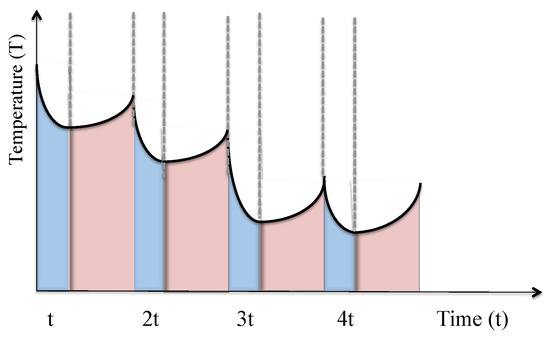 Schematic view of the expected dynamics of the temperature of a confined atomic gas during bubble collapse stages (blue) and expansion stages (pink). During expansion stages, heat is transferred from the outside into the inside of the bubble, thereby increasing the temperature of the atoms. During bubble collapse stages, heat is converted into light, thereby resulting in the cooling of the system in Figure 1. Eventually, both processes balance each other out and the temperature of the system remains constant on a coarse grained time scale.