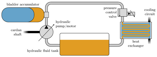 The hydraulic system consists of the following components: a hydraulic fluid tank, a hydraulic pump/motor which is mounted to and driven by the vehicle’s cardan shaft, a hydraulic bladder accumulator, a pressure control valve, a heat exchanger between the hydraulic fluid cycle and the vehicle’s cooling cycle and the pipes connecting named components. A scheme of the system is shown in Figure 1.