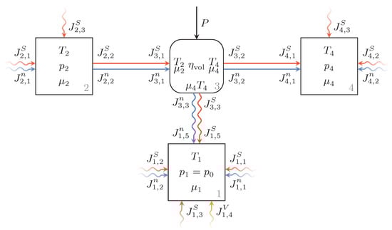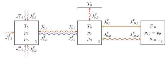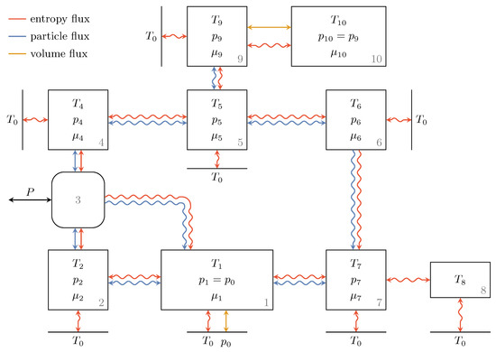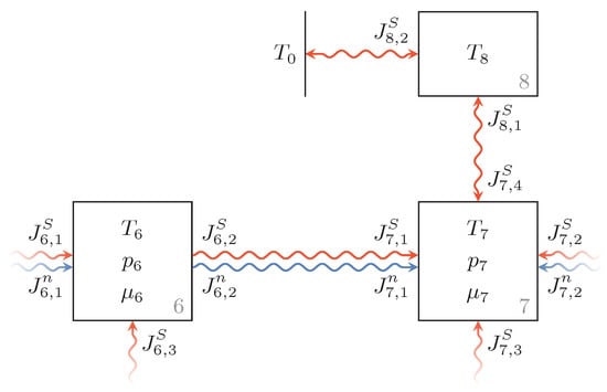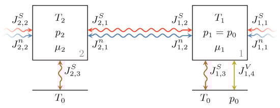 with from Equation (32) and . As length l, we use the distance between two hydraulic components i and j which are connected by the pipe segment. The entropy flux that is coupled to the particle flux is simply defined by for or otherwise, where is the molar entropy of the ith subsystem.