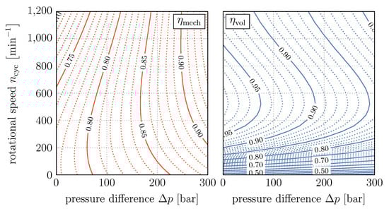 respectively. Figure 4 shows both efficiency maps over the relevant range of rotational speed and pressure difference for displacement factor .