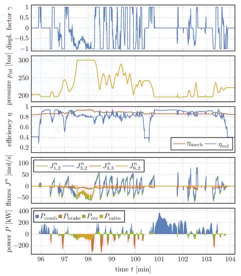 Furthermore, we use a realistic efficiency map which depends on the displacement factor , the rotational speed of the cardan shaft and the difference of the applied pressures . Hence, assuming the efficiencies to be identical for both directions of operation, for the mechanical and the volumetric efficiency applies