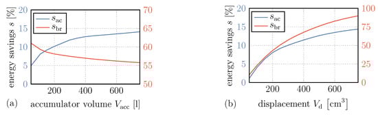 Electric and mechanical recuperation systems—or hybrid drive systems—have been extensively studied in the last decades [,,,,]. Hydraulic hybrid systems have also been part of a number of studies [,,,,], as well as their individual components such as the hydraulic accumulator [,,]. However, the focus of those investigations was rather on the appropriate control strategies for different hybrid types than on an overall thermodynamic description of the system. To investigate which effects may occur and how they can influence the recuperation potential of the system, such a comprehensive thermodynamic description is derived in this work. Based on real driving data, we then use this detailed model to predict the energy saving potential as well as the influence of certain design parameters and thermal effects.