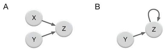 (A) A network where processes X and Y influence future state of Z, . (B) A feedback network in which processes Y and Z influence future state Z, .