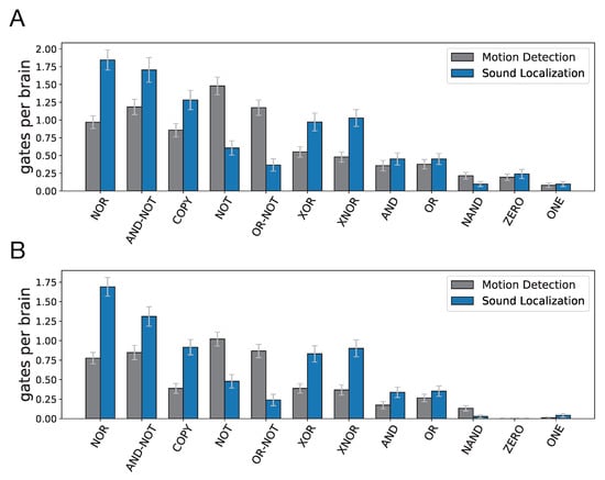 Frequency distribution of all, as well as essential, gates in evolved Markov Brains that perform the motion detection or sound localization task perfectly. (A) All gates. (B) Essential gates.