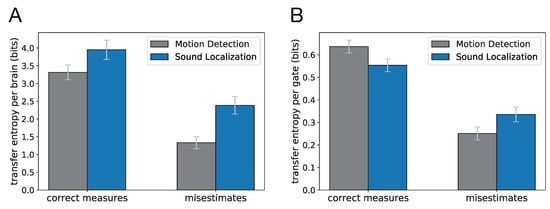 In our analysis, we only evaluated the contribution of gates deemed essential via the knockout test. For these essential gates, we summed the pairwise information flow misestimates as well as the correct information flow attributions in each evolved Brain. The mean values of calculated misestimates of information flow as well as correct measurements with their 95% confidence intervals for 98 evolved circuits that perform motion detection task, and for 71 evolved sound localization Brains are shown in Figure 5A. In Figure 5B, we normalized misestimates and correct measurements by dividing by the number of essential gates in each Brain, and averaged them across Brains. It is worth noting that the calculated information flow misestimates shown in these plots only reflect the misestimates that originated from the polyadicity or encrypting nature of the gates, since they are only based on the network structure and the gate composition of each Brain as well as the analytical results presented in Table 1, and do not take into account the errors that could occur as a result of factors such as sampling errors in the dataset or structural complexities in the network, such as recurrent or transitive relations [10,11,37]. Along the same line of reasoning, calculated values of correct measurements represent correct information flows that could be measured by transfer entropy in the absence of the aforementioned sources of errors.