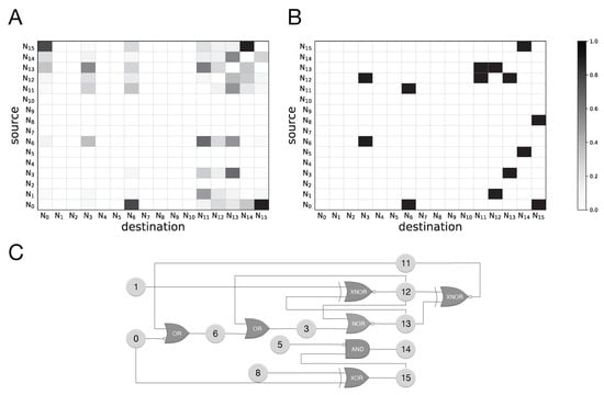 To create our “ground truth” model of direct influence relations, we take into consideration two different components of a Brain’s network. First, we take into account the input neurons of a gate and its output neuron, while we also take into consideration the type of the logic gate. For example, in the case of a ’ZERO’ gate where the output is always 0 we do not interpret this connection to reflect information flow (as there is no entropy in the output). Second, we analytically extract the binary state of each neuron as a Boolean function of all other neurons using a logic table of the entire Brain (logic table of size , for 16 neurons). This helps us rule out neurons that are connected as inputs to a logic gate while not actually contributing to the output neuron of that gate. Note that this procedure is specifically helpful in cases where more than one logic gate writes into a neuron (when more than one gate writes into a neuron the ultimate result is the bitwise OR of all incoming signals since if either one of them is a non-zero signal it would make the neuron fire, i.e., its state becomes 1). Figure 6B shows an example of “ground truth” influence map of neurons for a Brain evolved for sound localization. Each row of this plot shows the influence map of the corresponding neuron and each column represents the receptive field of that neuron. Note that in this plot values are binary, i.e., they are either 0 or 1 which specifies whether a source neuron influences a destination neuron, whereas TE measurements vary in the range [0, 1] bits. Keep in mind that this influence map is only an estimate of information flow gathered from gate logic and connectivity shown in Figure 6C.