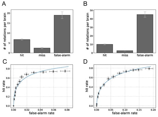In the ROC plots, the datapoint with the highest hit rate (right-most data point) is the normalized result shown in Figure 7A,B, that is, the analysis with a vanishing threshold. Note also that the data in Figure 7 represent hit rates against false-alarm rate for thresholds spanning the entire range [0,1], implying that hit rates cannot be increased any further unless we assume there is an information flow between every pair of neurons (hit rate = false-alarm rate = 1). The false-alarm rates in the ROC curves are actually fairly low in spite of the significant number of false alarms we see in Figure 7A,B. This is due to the fact that the number of existing pairwise information flows in a Brain network is much smaller than the number of non-existing flows between any pair of neurons (the influence map matrices are sparse). Thus, when dividing the number of false-alarms by the total number of non-existing information flows, the false-alarm rate is low.