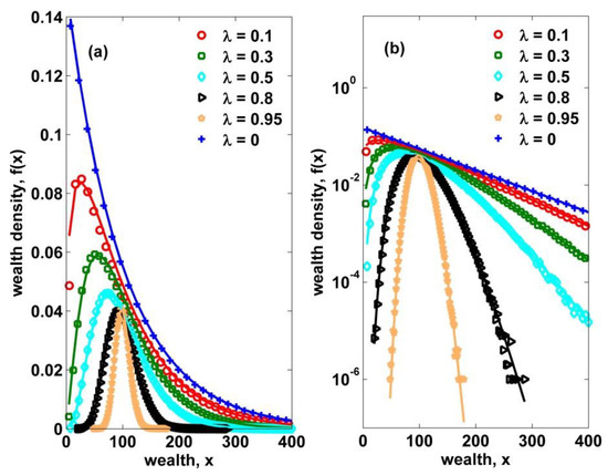 Linear (a) and semi-log (b) plots of the probability density of wealth from numerical simulations (dots) for homogeneous saving propensities with varying values in the interval , compared with the theoretical curves defined by Equations (8)–(10). When , the curve becomes the Boltzmann–Gibbs distribution. Also, when approaches 1, the peak shifts to the mean value and the fluctuations get smaller as predicted by the mode obtained from Equation (8).