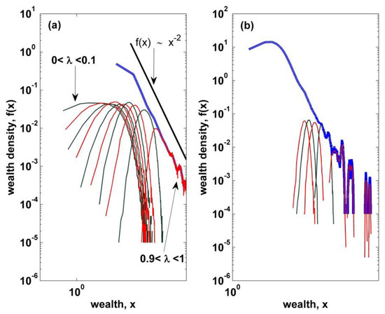 with a Pareto exponent in the case of uniformly distributed and with if the density satisfying that for . As reported in [35], the wealth distribution of the single agents, belonging to a sub-interval of the range , is not of a power-law type but has a well-defined mode with an exponential tail, which is similar to the case with a constant saving propensity , as shown in Figure 2. Thus, the power law seems to arise from the superposition of these partial gamma-like distributions corresponding to the various batch of ’s, where the average value is proportional to and thus extended to very large values of (see Figure 2). Roughly, the significant contribution from partial distributions to a power-law seems to be concentrated on the partial distributions with large saving propensities ’s belonging to .