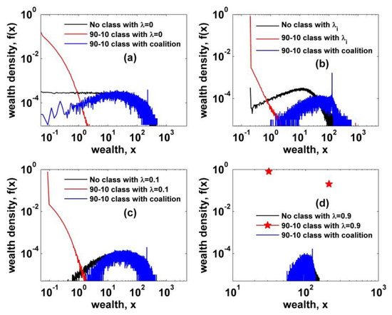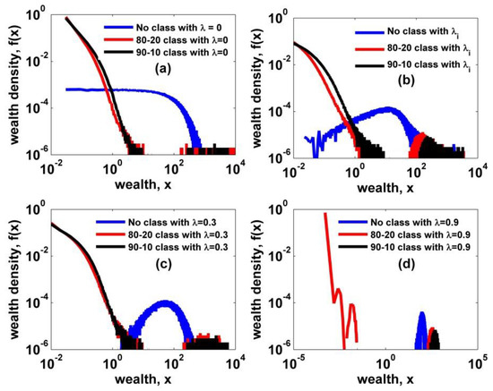 Wealth density functions of no-class and two-class cases are plotted for comparison. (a) A simple exchange model with no saving; (b) an exchange model with heterogeneous saving; and exchange models with homogeneous saving, (c) = 0.3 and (d) = 0.9. One salient feature is that a power-law in the lower part is clearly observed and the other exciting finding is that the differentiation is intensified with increasing homogenous saving propensity, as shown in (c) and (d).