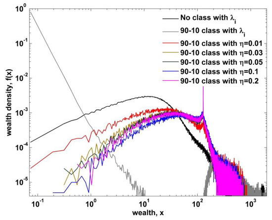 For the kinetic exchange models, there have been many developments analytically and numerically [18,19,20,21,22,23]. Thus, we start our study from the existing kinetic exchange models, which are greatly adaptable for simulation and give the insights on empirical distributions of income and wealth in human societies. The goal of our study is to develop an agent based model incorporating the dynamic aspects of the Pareto regime [26] and the polymodal forms of income/wealth distribution [27,28] under the condition of constant total income/wealth. To this end, we first build a two-class society consisting of the lower end and the higher end, which are arbitrarily determined on 90–10 or 80–20 rules for simplicity. A two-class society is simply based on the fact of two-class structure of income distribution such as exponential bulk and power-law bulk [26]. Different from the random exchange rule taken in the classical kinetic exchange models [6,7,8], we adopt a wealth-dependent trading rule among agents belonging to different classes, according to which agents take part in a winner-take-all trade with their own wealth-weighted winning probability, respectively. By introducing a wealth-dependent trading rule, we simply replicate the unilateral flow of wealth via a premium from investment proportionate to invested wealth between the rich and the poor. The random exchange rules apply to agents belonging to the same class for both the poor and the rich. Then, we examine the change of wealth distributions over varying model parameters such as saving propensity and classifying criteria, that is, 90–10 and 80–20 rules. Second, we allow agents in the lower class to form solidarity against an agent in the upper class when they interact economically via wealth exchange. This additional restriction on the trading rule is motivated from activities of labor unions to a big as well as the government’s income inequality-mitigating policies such as increasing minimum wage and intensifying progressive taxes on people in the high-income brackets. By varying the solidarity parameter, we examine the change of income/wealth distributions and quantify the level of inequality in terms of inequality indices such as the Gini coefficient and the entropy measure.
