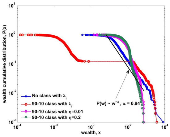 Frequency distributions of a variety of statistics in social systems—such as income, wealth, city sizes, price-fluctuation of stock markets, and so on—show a power-law behavior. Among them, the distribution of income and wealth in a society was known to follow a power-law by V. Pareto in 1897 [1] and, since then, many empirical and numerical studies have been performed and newly discovered facts are reported over the whole range distribution functions [2,3,4,5,6,7,8]. The so-called Pareto law is valid only for the high rich people [9,10,11,12] and for the majority of non-rich people different distributions such as exponential and/or gamma-like functions are well fitted to the empirical statistics [13,14,15]. To explain the observed features of distributions of income and wealth, several agent-based models have been proposed on the basis of stochasticity and statistical mechanics. For the former, the variations of income and wealth are described in terms of stochastic terms, namely additive and multiplicative [6,16,17]. An additive term represents salaries while a multiplicative term represents a premium from investment proportionate to invested wealth. Their distribution is quite different from Gibbs and Gamma distributions and shows a power-law tail at large wealth and a sharp cutoff at small wealth. As for the latter, several physicists proposed kinetic exchange models of money or monetized wealth from analogy with an ideal gas in equilibrium for recent decades [7,8,18,19,20,21,22,23] although sociologist John Angle first proposed a class of stochastic processes for the universal emergence of inequality in wealth distribution [5]. By introducing saving propensities, gamma-like distributions were obtained as stationary distributions [24]. Kinetic exchange models with saving propensity shed a light on how rich people gain a huge wealth. A saving propensity is a key ingredient, which is correspondent to the multiplicative term in stochastic wealth models. When saving propensity is distributed heterogeneously to agents, a power-law tail appears in distribution functions as done by a multiplicative term in the stochastic wealth process [25].