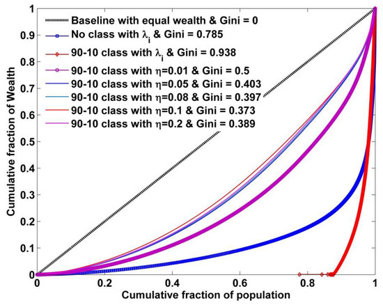 In order to quantify the overall wealth inequality for the kinetic exchange models considered, we use the Lorenz curve and the Gini coefficient as shown in Figure 7. The Lorenz curve is a standard way of representing income/wealth distribution in the economic literature [36]. It is defined by two coordinates X and Y depending on a wealth parameter and a wealth density function ,