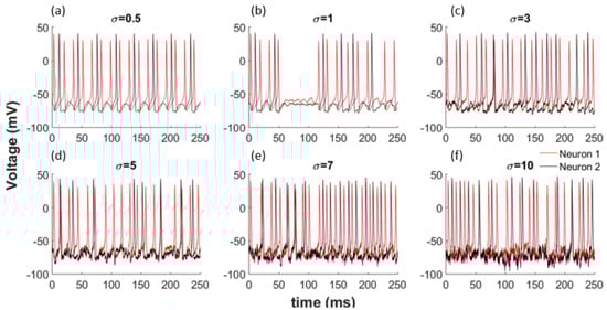To better understand the effects of noise on the network shown by Equations (16) and (17), we use zero mean Gaussian distributed random variables with standard deviation . When we incorporate this noise with different variances into our model, as illustrated in Equations (16) and (17), we observe a change in the synchronisation of the neurons. Additionally, the obvious patterns disappear totally for larger noise amounts as shown in Figure 2 for each coupled network. Noise can change the synchronization of neurons by inducing or deleting spikes in the network.