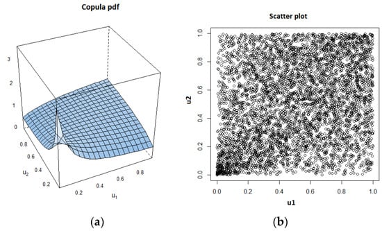 As an example, we show the estimated copula pdf and the scatter plot, which were obtained using a data set for the case of k = 0.1 and = 10, in Figure 4.