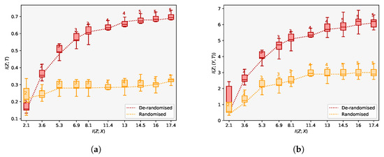 (a) Information curves for I(Z; T) and (b) I(Z; (Y, T)) with de-randomised and randomised data respectively. When the data are randomised, the value of I(Z; T) is close to zero. The differences between the curves illustrates confounding. When data are de-randomised, we are able to estimate treatment effects more accurately by accounting for this confounding.