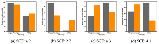 Illustration of the proportion of major ethnic groups within the four clusters. Grey and orange indicate de-randomised and randomised data respectively. For better visualisation, we only report the two main clusters which include the majority of all patients. The first cluster in (a) is a neutral cluster. The second cluster in (b) shows an enrichment of information in the African-American group. Clusters 3 and 4 in (c,d) respectively, show an enrichment of information in the White group. Overall, the clusters exhibit a distinct structure with respect to the known ethnicity confounder. Moreover, each of the clusters is associated with different Specific Causal Effect (SCE) values. In particular, the second cluster has a lower SCE which suggests that educational intervention for these members has less of an impact on outcomes—a result consistent with our de-randomisation strategy.
