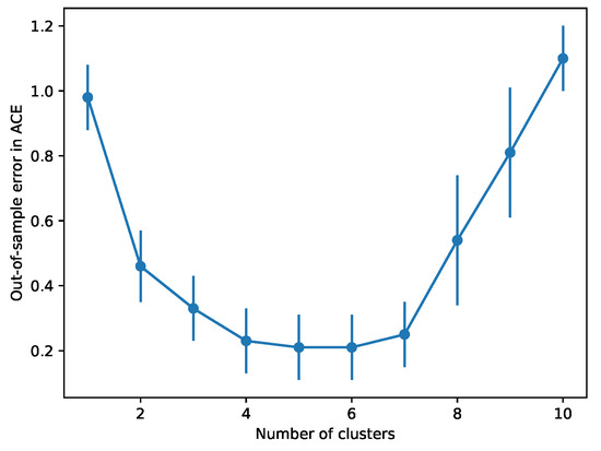 We also analysed the discretised latent space by comparing the proportions of ethnic groups of test subjects in each cluster in the de-randomised setting. These results are shown in Figure 4 where we plot a hard assignment of test subjects to clusters on the basis of their ethnicity. Evidently, the clusters exhibit a clear structure with respect to ethnicity. In particular, Cluster 2 in Figure 4b has a significantly higher proportion of non-white members in the de-randomised setting. The discretisation also allows us to calculate the SCE for each cluster. In general, Cluster 2 tends to have a lower SCE than the other groups. This is consistent with how the data were de-randomised, since we removed a proportion of the treated instances with non-white mothers. Conditioning on this kind of information is thus crucial to be able to accurately assess the impact of educational intervention on test scores. Finally, we assess the error in estimating the ACE when varying the number of mixture components in Figure 5. When the number of clusters is larger, the clusters get smaller and it becomes more difficult to reliably estimate the ACE since we average over the cluster members to account for partial covariate information at test time. Here, model selection is made by observing where the error in estimating the ACE stabilises (anywhere between 4 and 7 mixture components).