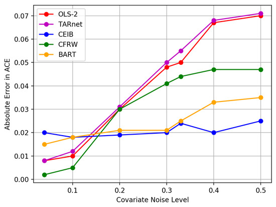 Absolute error in ACE estimation for Twins task. CEIB outperforms baselines over varying levels of covariate noise.