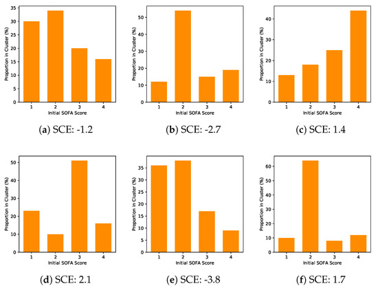 The information curves for and are shown in Figure 7a,b respectively. We observe that we can perform a sufficient reduction of the high-dimensional covariate information to between four and six dimensions while achieving high predictive accuracy of outcomes Y. Since there is no ground truth available for the sepsis task, we do not have access to the true confounding variables. However, we can perform an analysis on the basis of the clusters obtained over the latent space. Here, we see that we can characterise the patients in each cluster according to their initial SOFA (Sequential Organ Failure Assessment) scores. SOFA scores range between 1 and 4 and are used to track a patient’s stay in hospital. In Figure 8, we observe clear differences in cluster composition relative to the SOFA scores. Clusters 2, 5 and 6 tend to have higher proportions of patients with lower SOFA scores, while Clusters 3 and 4 have larger proportions of patients with higher SOFA scores. This result suggests that a patient’s initial SOFA score is potentially a confounder when determining how to administer subsequent treatments and predicting their odds of in-hospital mortality. This is consistent with medical studies such as Medam et al. [52], Studnek et al. [53] where authors indicate that high initial SOFA scores were likely to impact on their overall chances of survival and treatments administered in hospital.
