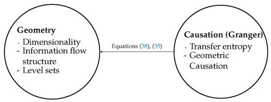 As theory suggests, see the sections above, there is a strong relationship between the information flow (causality as measured by transfer entropy) and the geometry, encoded for example in the estimates leading to Equation (36). The effective dimensionality of the underlying manifold as projected into the outcome space is a key factor to identify the causal inference between chosen variables. Indeed, any question of causality is in fact observer dependent. To this point, suppose only depends on and , where . We noticed that (Section 2) . Now, notice that Therefore, in the case that is two-dimensional, then would be a one-dimensional, manifold if and only if . See Figure 3. With these assumptions,