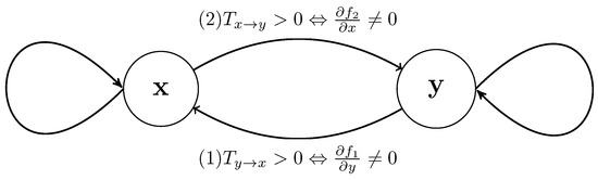 The definition of transfer entropy [7,8,23], measuring the influence of coupling from variables y onto the future of the variables x, denoted by is given by: