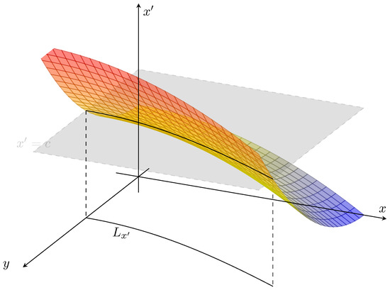 Ω2 = X × X′ manifold and Ly level set for (a) x′ = f1(x) = −0.005x2 + 100, (b) x′ = f1(x, y) = −0.005x2 + 0.01y2 + 50. The dimension of the projected set of (x, x′) depends on the causality as just described. Compare to Figure 4 and Equation (27).