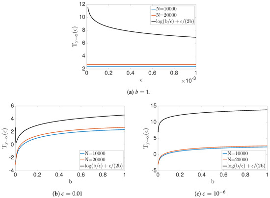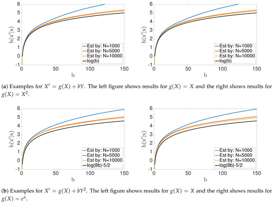 Therefore, when , the transfer entropy . In addition, notice that as . Therefore, convergence of the numerical estimates is slow when is small (see Figure 6).