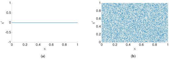 To illustrate the idea of geometric information flow, let us first consider a simple example, . If , we have and, when , we have the case. Therefore, dimensionality of the data set will change with parameter b (see Figure 7). When the number of data points and , then . Generally, this measure of causality depends on the value of b, but also the initial density of initial conditions.