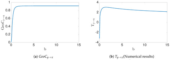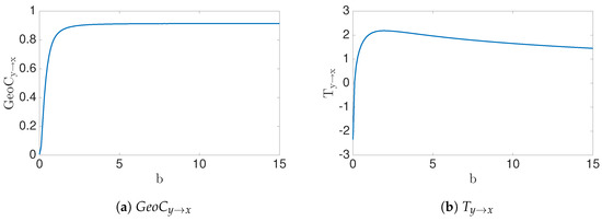 (a) shows the geometric information flow and (b) represents the Transfer entropy for x′ = x + by data. The figures show the changes with parameter b. We can notice that the transfer entropy has similar behavior to the geometric information flow of the data.