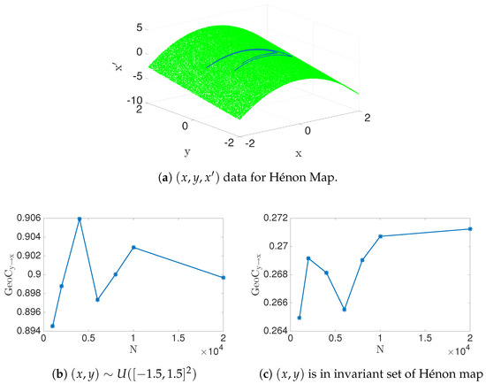 Consider the Hénon map, Equation (44), within the domain [−1.5, 1.5]2 and the invariant set of Hénon map. (a) the uniform distribution case (green) as well as the natural invariant measure of the attractor (blue) are shown regarding the (x, y, x′) data for both cases; (b) when (x, y) ∈ [−1.5, 1.5]2, notice that GeoCy→x = 0.9, and (c) if (x, y) is in an invariant set of Hénon map, then GeoCy→x = 0.2712.