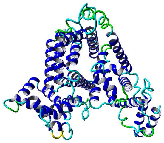 Structure of the albumin protein in a ribbon-like form. The colors on the molecular surface indicate the secondary structure: blue—-helix, green—turn, yellow—3–10 helix, cyan—coil.
