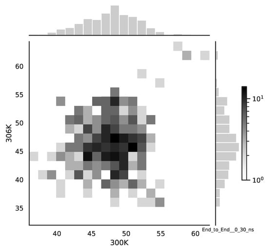 Table 7, Table 8, Table 9 and Table 10 give the different statistical approaches, without the averaging over the time step). We present there all end-to-end signals for one temperature, and for each moment of time, we calculate the average only over all simulated molecules. In the next step, we calculate normalized histograms. After obtaining numerical distributions, we calculate the Kullback–Leibler divergence between distributions of mean end-to-end signals. The results for the time window 0–30 ns are presented in Table 7.
