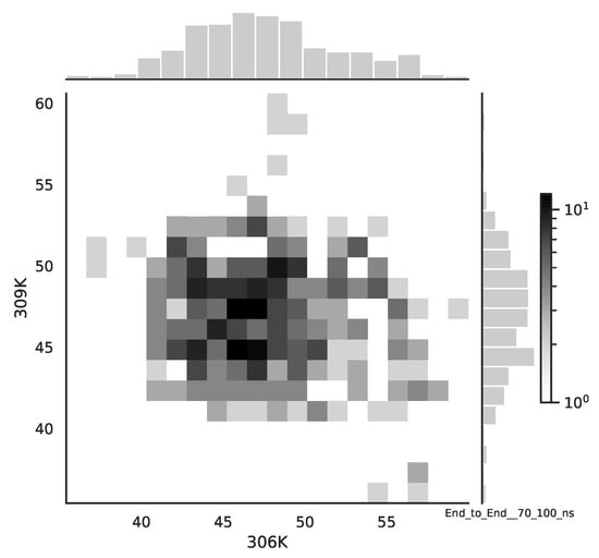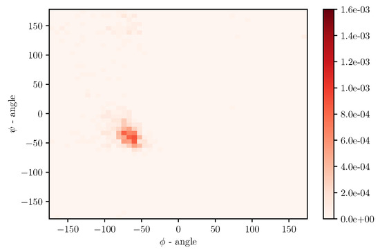Simulations of albumin dynamics can be used to obtain frequency distributions of angles and . An exemplary 2 D histogram of such a distribution is presented in Figure 8. We can see that most data are concentrated in a small area of space of angles. Similar behavior can be observed for other temperatures and simulation times. This is because the structure of the investigated protein is quite rigid, and there appears to be only a little angular movement. Nevertheless, we can observe variations of the conformational entropy, estimated with such a histogram (see Figure 9).