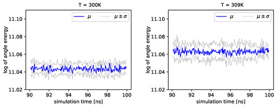 The distribution of backbone dihedral angles carries information of the molecule’s dynamics, as they are tightly connected to its elasticity. Using simulations, we can determine the angle and the angle (see Introduction). Next, we can determine energies that depend on these angles by employing Formula (17). In Figure 4 and Figure 5, we present the logarithm of the angle energy component for two temperatures. Figure 4 presents values in a period of time 0–10 ns, and Figure 5 presents values in a period of time 90–100 ns. We can see that these values fluctuate around the mean value. Such dynamics are similar for all temperatures, but the mean energy rises slightly with increasing temperature. In Figure 5, the blue line presents a logarithm of the mean value of angle energy and the gray line presents values of the standard deviation. We can see that changes in energy are much more evident.