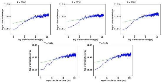 Dihedral energies for each temperature vs. simulation time. We use the double logarithmic scale. Green lines represent linear regression.