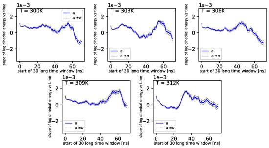 Further, referring to Figure 6 and Figure 7, we can see that the dihedral energy seems to obey (at least at some range of simulation times) the power law-like relation, although the scaling exponent is relatively small. In Figure 7, we can see this relation in the range of temperature from 306K–309K. This exponent does not change in time t too much. It suggests stable behavior. We consider the conformational entropy of the system. For its plot versus simulation time see Figure 9 and Figure 10. On each graph, we can observe a pattern which seems to attain an oscillatory behavior. Fisher’s test allows describing this property by providing the p-value parameter. If this parameter, for some time series of entropy, is relatively small in contrast to p-value parameters for another time series of entropy, then the statistical hypothesis : is less probable than in another case. In Table 14, we can observe that in the range of temperature 303K–309K, there is a local minimum of p-values. A similar effect can be observed in Table 15 when we calculate the mean p-value for each column. We can also observe that there is a local minimum of around . A smaller mean p-value is seen for and . This means that both temperatures exhibit the analogical tendency to favor the hypothesis . We can also see this in Figure 9, where for temperatures , , and , the regularity of periodicity increases more than at other temperatures. Other tests, including the Kruscal–Wallis test followed by the Conover–Iman multi-comparison test, Kullback–Leibler distance, and Kullback–Leibler divergence give consistent results, while referring to the mean RMSD of the protein of interest.
