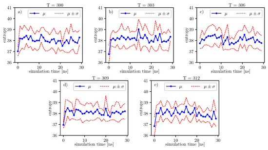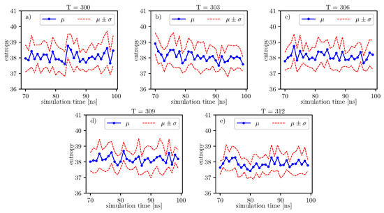According to formulas connecting the probability distribution of angles and entropy [17], we can follow changes of entropy in time and temperature. Values of conformational entropy for various temperatures and with simulation time 0–30 ns are presented in Figure 9, where the blue line represents the course of the mean entropy value over time. The calculations take into account nine simulations, and one dot presents one arithmetic mean of entropy. Here, we can see that during simulations, some oscillations can appear. Therefore, for each temperature, we perform Fisher’s test. Results of this test are presented in Table 14.