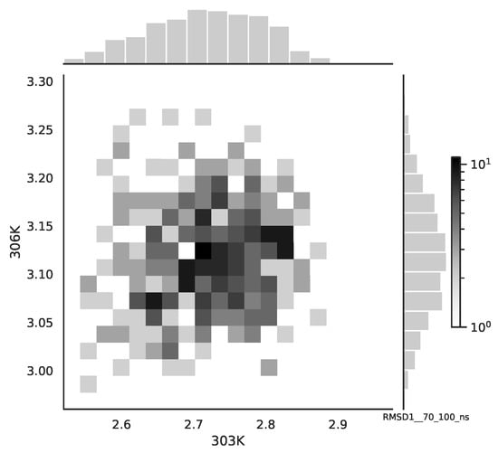 The bivariate histogram of the chosen mean RMSD signals in the 70–100 ns time window.