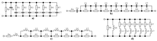 Basic network structures of fully passive ladder circuits dedicated for approximation of CPE: (a) series-parallel RC, (b) parallel-series RC, (c) parallel-series RL, (d) series-parallel RL.